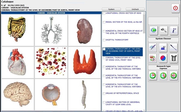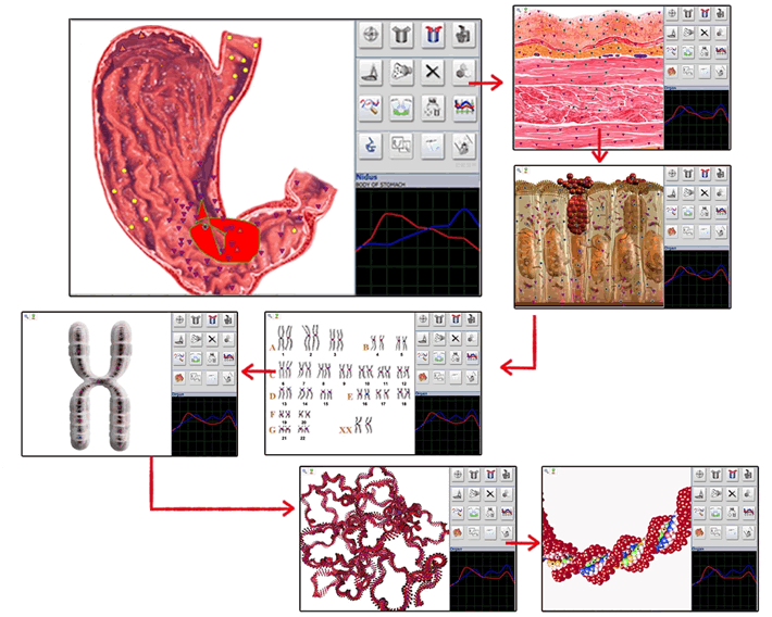 During a research the gross changes in tissues shown on macro cuts are revealed, and then a research of the histological cuts of the chosen tissues is carried out in a place of major pathological changes. Then, after histological cut research is done, the search of significantly changed cells is carried out in order to find changes in cell structures. This algorithm then goes to the level of chromosome set, looks for the changes in separate chromosomes, after that starts a research of DNA helix. Also user may carry out the research of multivariate topological picture and metastatic disease. It allows additional searching for metastasis in other organs. The researches are held in automatic mode and user can interrupt it in any moment.